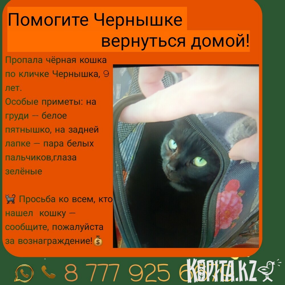 Пропала чёрная кошка по кличке Чернышка, 9 лет. Особые приметы: на груди — белое пятнышко, на задней лапке — пара белых пальчиков,глаза зелёные 🐈⬛ Просьба ко всем, кто нашел кошку — сообщите, пожалуйста за вознаграждение!💰 Ватсап,тел:87009878172